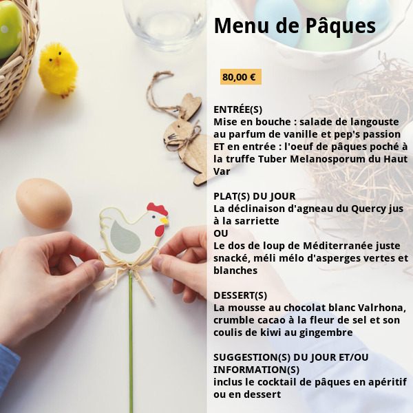 Au bord du lac de l’Aréna, avec vue sur le Rocher de Roquebrune, le Restaurant du Lac propose pour Pâques un menu aux saveurs du terroir : en entrée un feuilleté printanier aux asperges et œufs de caille, en plat une tranche de gigot farci accompagnée d’un écrasé de pommes de terre à la truffe, et en dessert une création du Chef au chocolat.