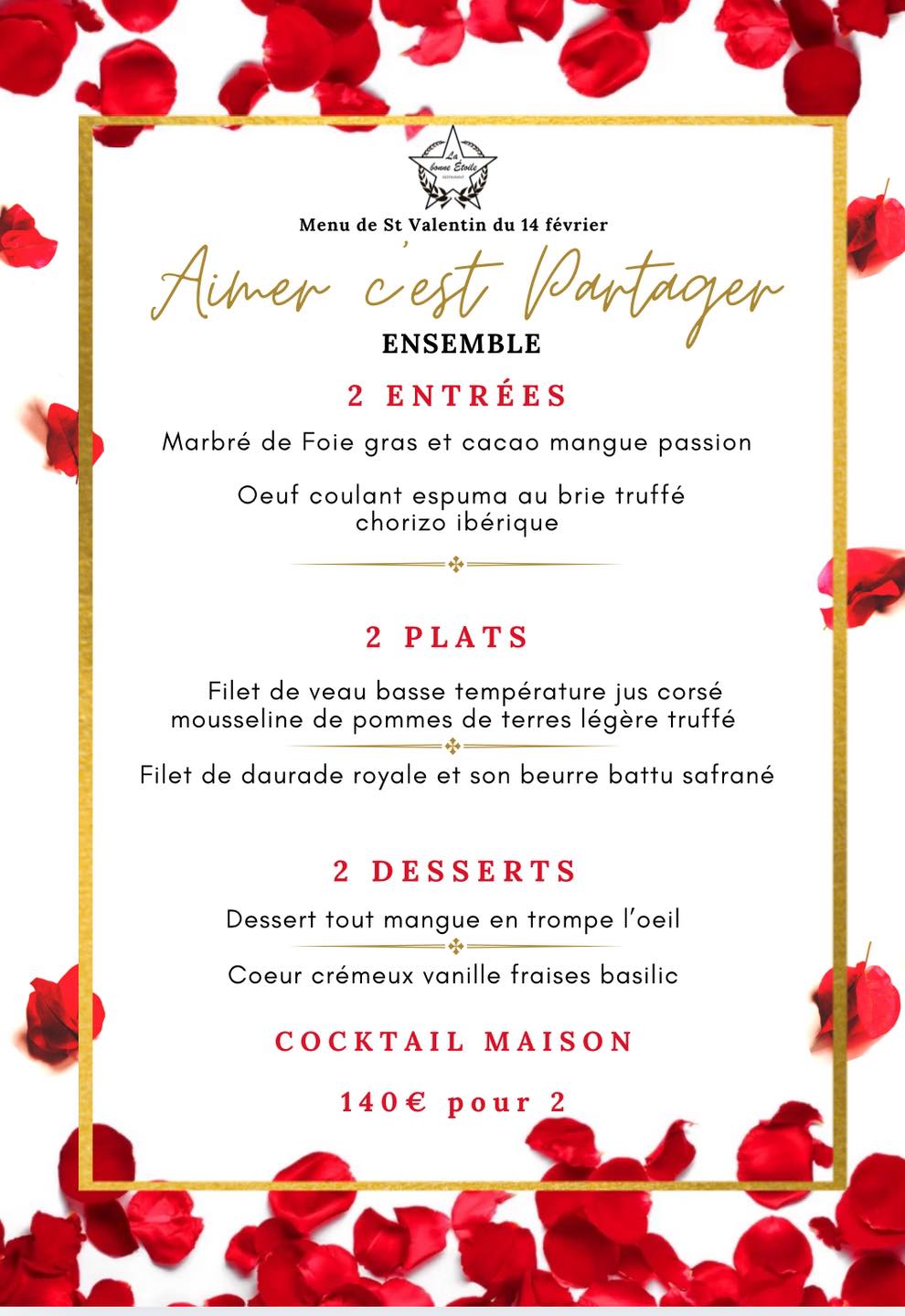 « Aimer c’est Partager Ensemble » : le titre du menu dit tout. La Bonne Étoile a pensé cette soirée comme un moment à vivre à deux, avec un menu qui multiplie les propositions et invite au partage. Une cuisine raffinée qui joue sur les textures et les saveurs, dans un cadre élégant. Pour ceux qui veulent faire de ce 14 février un vrai moment suspendu.