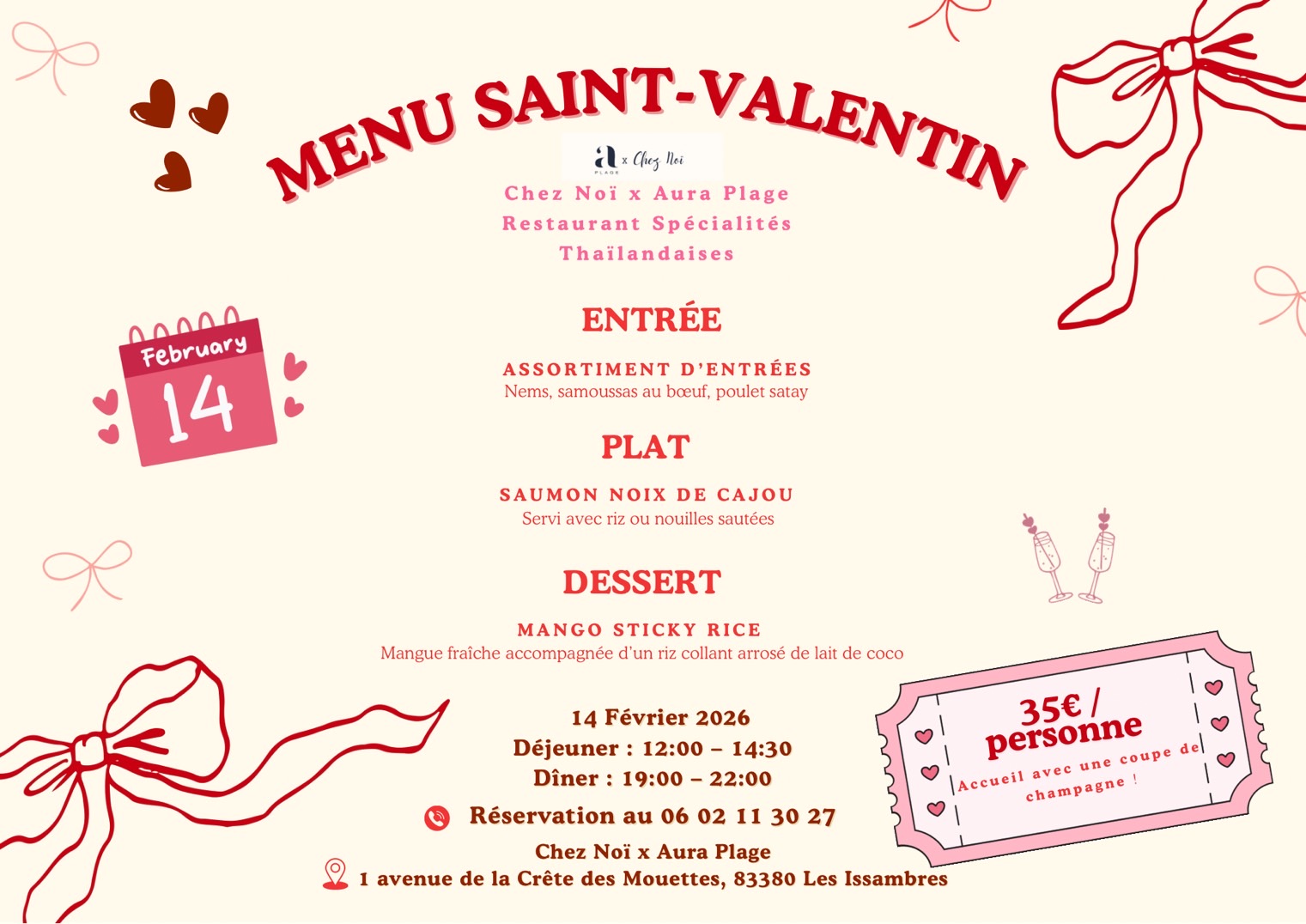 Et si on célébrait autrement cette année ? Chez Noi vous embarque direct en Thaïlande, sans quitter Les Issambres. Une cuisine authentique, des saveurs franches, et cette hospitalité asiatique qui vous met tout de suite à l’aise. Le menu Saint-Valentin joue la carte de l’exotisme avec finesse, coupe de champagne à l’arrivée incluse. Une adresse idéale pour une Saint-Valentin originale dans le Var.
