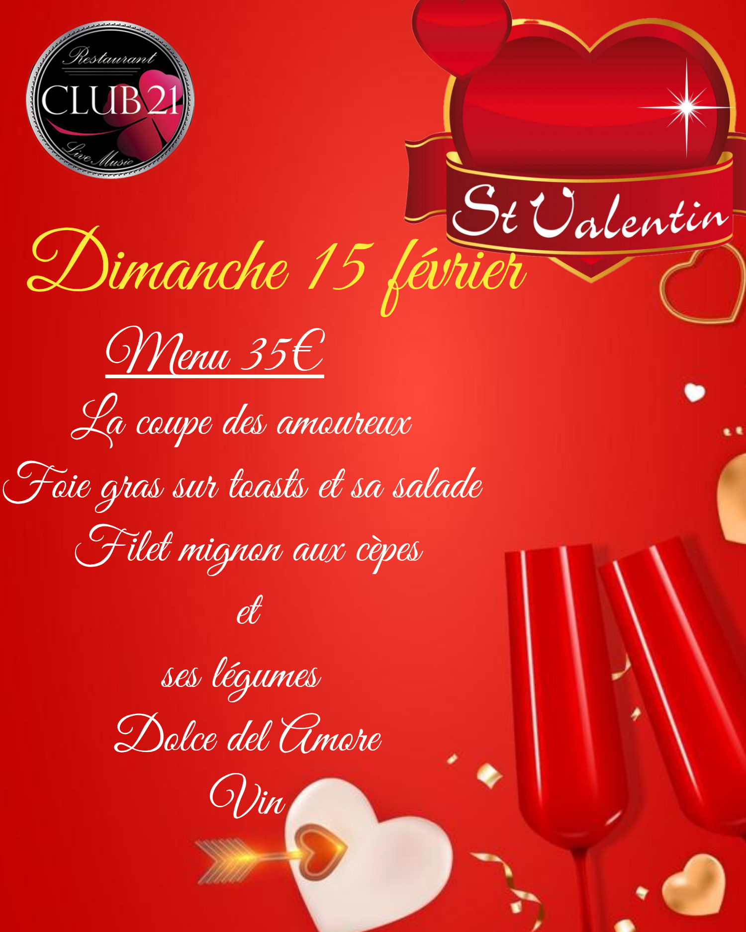LAu Club 21, on a décidé de voir les choses autrement pour la Saint-Valentin. En plus du menu « Coupe des amoureux », la soirée du 14 février promet d’être animée : orchestre et DJ au programme. Parce qu’après tout, qui a dit qu’on ne pouvait pas mélanger bonne table et envie de bouger ?
