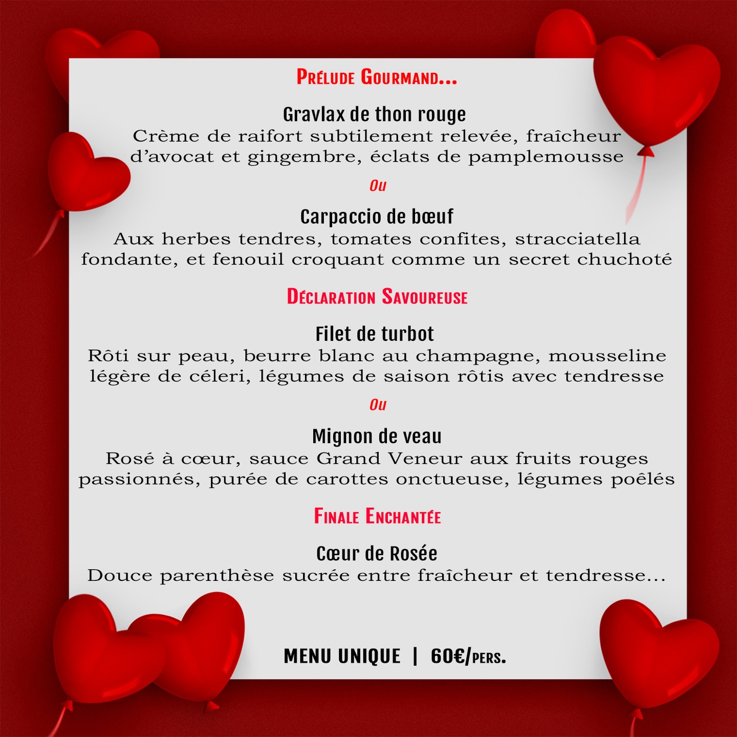 Pour la Saint-Valentin, le chef a imaginé un menu baptisé « Prélude Gourmand », « Déclaration Savoureuse » et « Finale Enchantée ». Entre terre et mer, avec cette touche raffinée qui séduit à chaque fois. Pour ceux qui cherchent l’équilibre parfait entre gastronomie et convivialité.
