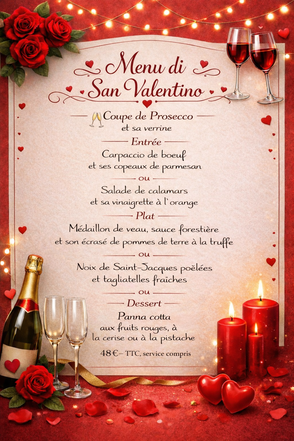 Au Marmiton, on mise sur l’essentiel : une cuisine généreuse, des classiques bien maîtrisés, et cette ambiance chaleureuse qui vous met tout de suite à l’aise. Le menu Saint-Valentin reste fidèle à l’esprit maison avec la sélection de bons produits.